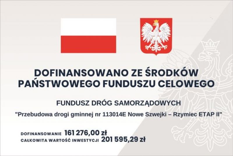 Zakończono inwestycję polegającą na przebudowie drogi gminnej Nowe Szwejki – Rzymiec. Przebudowa polegała na wykonaniu wyrównania istniejącej uszkodzonej nawierzchni asfaltowej mieszanką mineralno-bitumiczną, położeniu nowej nawierzchni asfaltowej i odtworzeniu poboczy na długości 649 m.