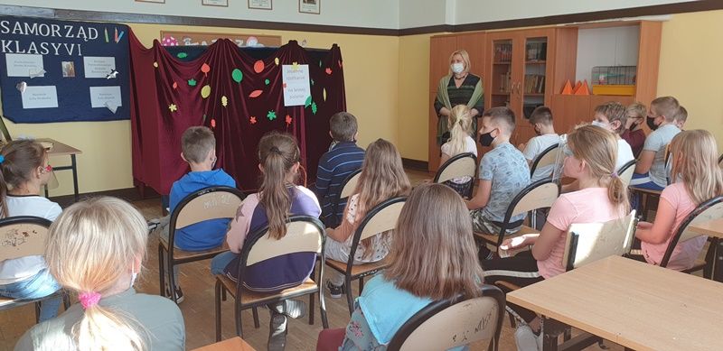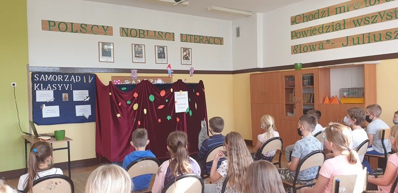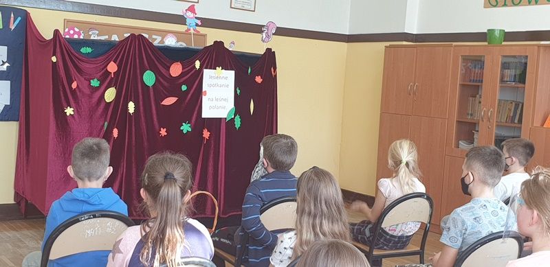 Przygody bohaterów: wiewiórki, misia, krasnala i muchomora, zrobiły na najmłodszych ogromne wrażenie i z pewnością na długo pozostaną w ich pamięci. Taki teatr nie wymaga dużego nakładu finansowego – scenę łatwo zbudować z parawanu, krzeseł i koców, a pacynki i kukiełki można wykonać samemu. Przedstawienie kukiełkowe zostało przygotowane przez nauczyciela – bibliotekarza Panią Beatę Matysiak i Panią Martę Kajtaniak. Teatrzyk biblioteczny odbył się zgodnie z procedurami bezpieczeństwa obowiązującymi podczas panującej epidemii COVID-19.
