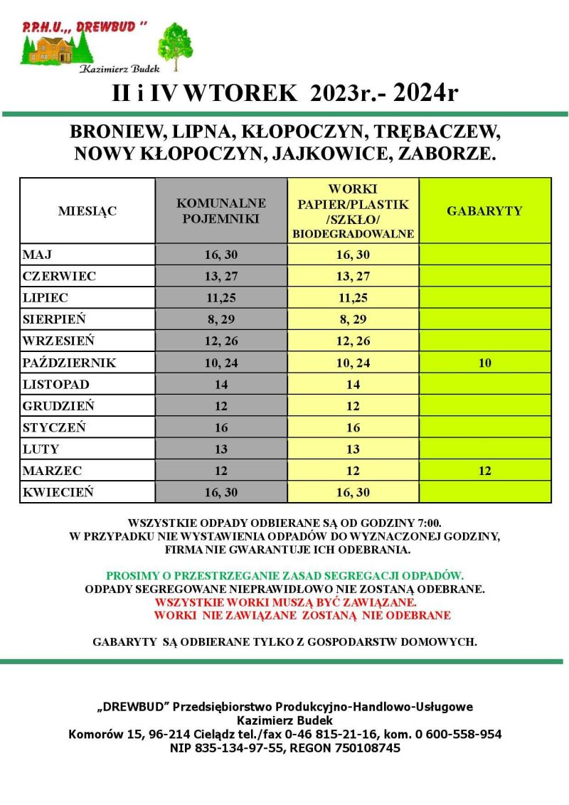 UWAGA !!! Zmiana w harmonogramie odbioru odpadów II i IV WTOREK 2023 – 2024 r. dotyczy miejscowości Broniew, Lipna, Kłopoczyn, Trębaczew, Nowy Kłopoczyn, Jajkowice, Zaborze
