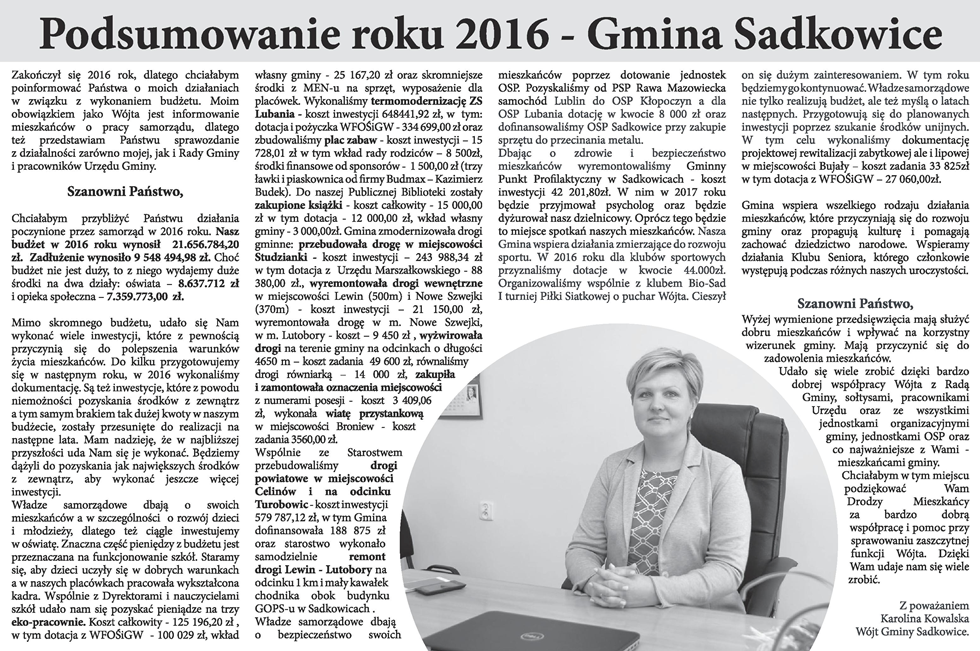 20 grudnia 2016 r. dokonano odbioru końcowego inwestycji: Termomodernizacji Zespołu Szkół w Lubani. W ramach tej inwestycji zostały ocieplone ściany budynku szkoły, została wymieniona stolarka okienna i drzwiowa oraz dokonany został remont cokołu i schodów wejściowych. Symbolicznego otwarcia wyremontowanego budynku, dokonali: Cezary Dzierżek- Zastępca Prezesa Zarządu WFOŚiWGW, Józef Matysiak- Starosta Rawski, pani Wójt Karolina Kowalska, Przewodniczący Rady Gminy Tadeusz Pietrzak, Pani Dyrektor Maria Charążka.