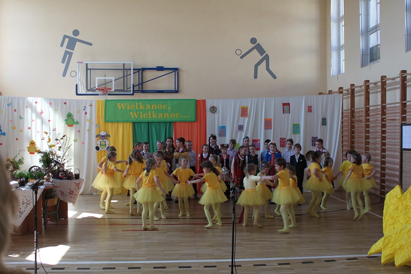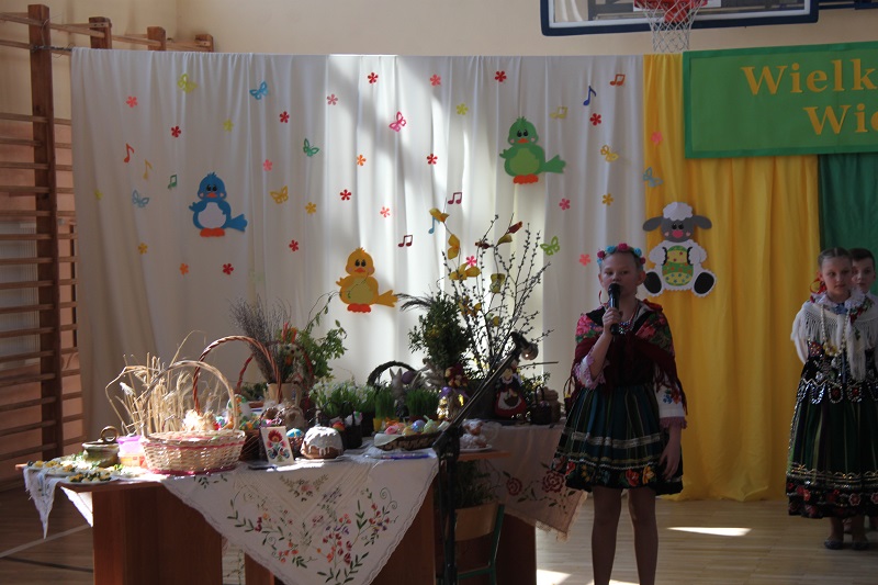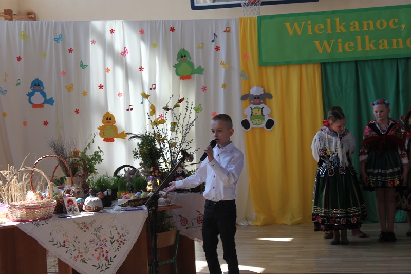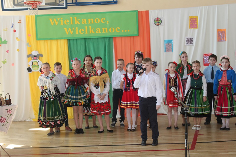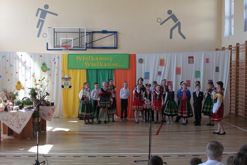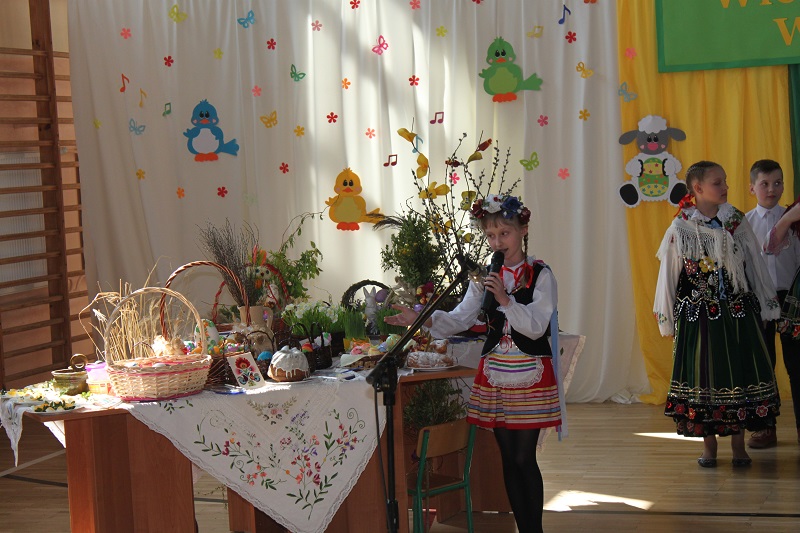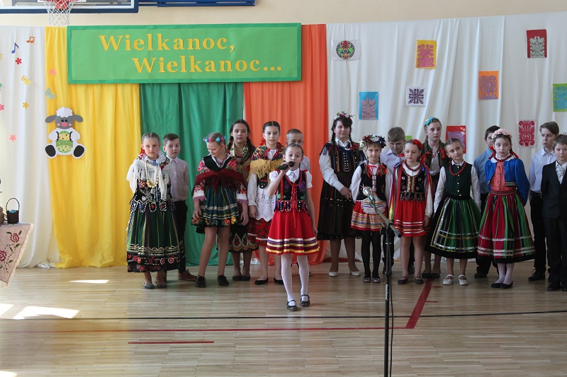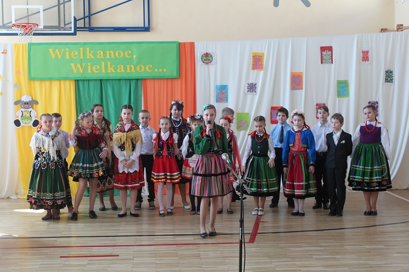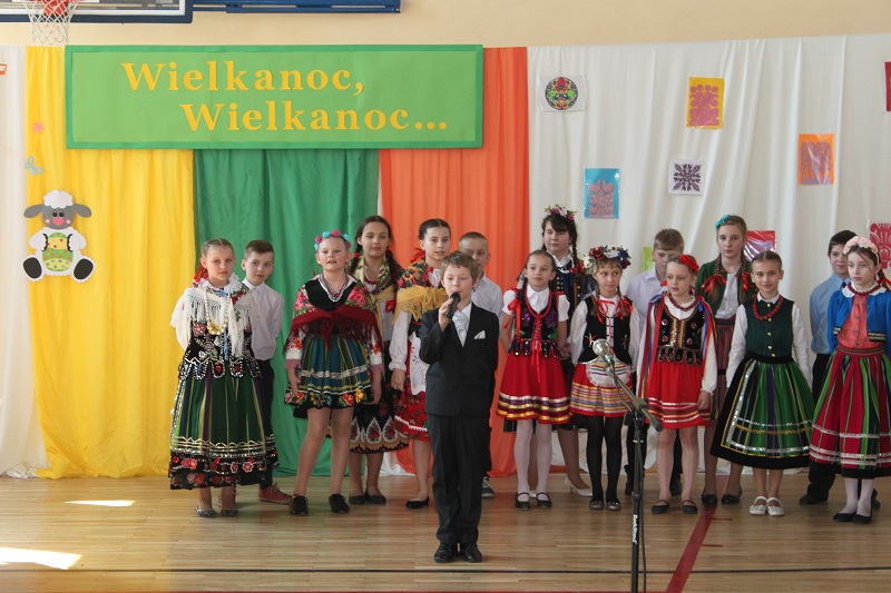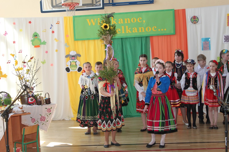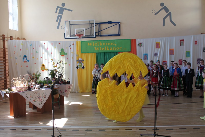 10.04.2017 r. był okazją do spotkania całej braci szkolnej i zaproszonych gości, którzy licznie przybyli na naszą szkolną uroczystość wielkanocną. W tym roku prezentowała się klasa IVb szkoły podstawowej. Program artystyczny rozpoczął się dźwiękami muzyki Atonio Vivaldiego „Wiosna”. Uczniowie w odświętnych strojach przybliżyli wszystkim wielkanocne obyczaje. Oglądających zachwyciły stroje ludowe w jakich wyjątkowo urokliwie prezentowały się dziewczęta. Furkotały spódniczki i wstążki, bujały korale i warkocze. Uczniowie malowali pisanki, prezentowali dostojną palmę wielkanocną, babę z ciasta i baranka cukrowego. Z zaangażowaniem deklamowali wiersze i śpiewali piosenki tematyczne. Nie zabrakło wielkanocnej, wzruszającej pieśni „Alleluja”. Czwartoklasiści podzielili się ze wszystkimi jajkiem i obdarowali oglądających pisankami wielkanocnymi, które sami wykonali. Występ uświetniły dzieci klas młodszych wykonując „Taniec kurcząt w skorupkach” Modesta Musorgskiego. Ten żywy obrazek wyjątkowo chwytał za serce. Dumę odczuwali zwłaszcza zgromadzeni rodzice pociech. Na scenie panowała radosna, świąteczna atmosfera. Klimat wielkanocnej wiosny widoczny był w scenografii. Jasne, żywe kolory, zieleń gałązek i wyeksponowany stół z dobrami wielkanocnymi wpisały się w świąteczny nastrój. Przyjemnie było wrócić słowami i piosenką do dawnych zwyczajów śmigusa –dyngusa, wspólnego uwijania palm wielkanocnych i gromadnego biesiadowania przy świątecznym stole.