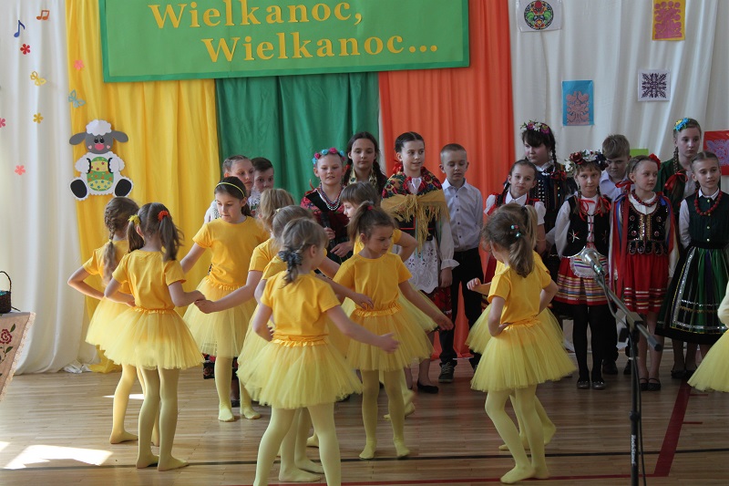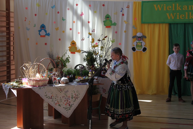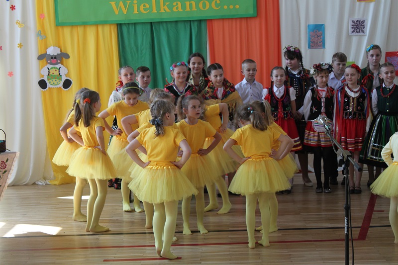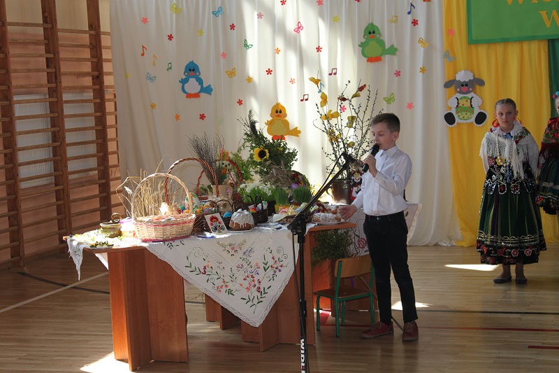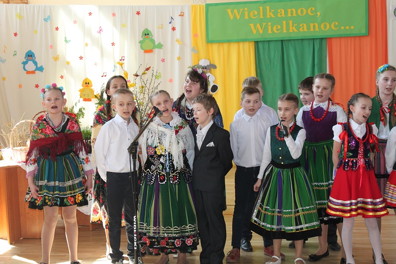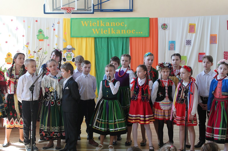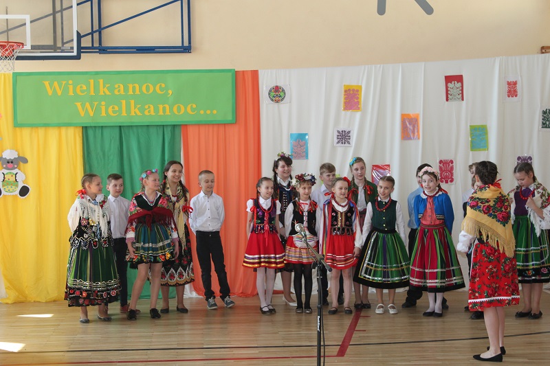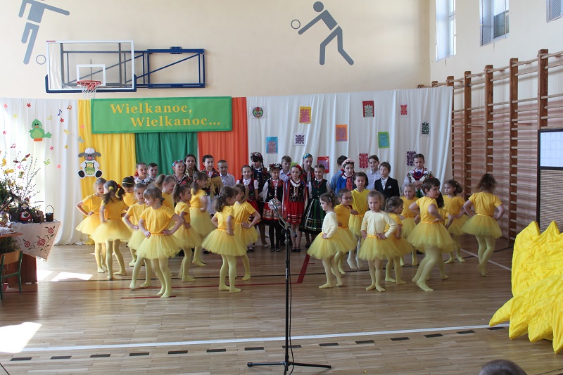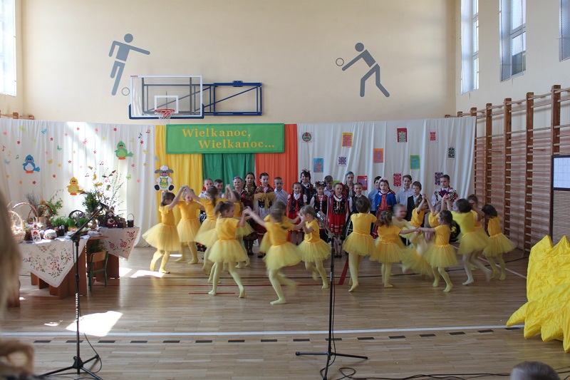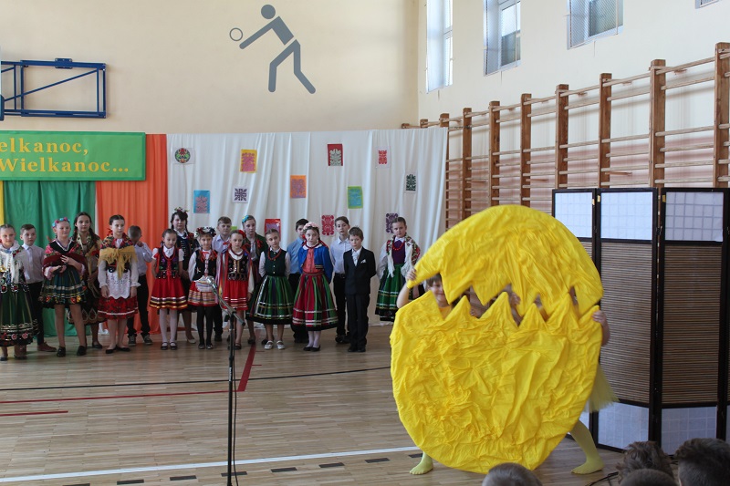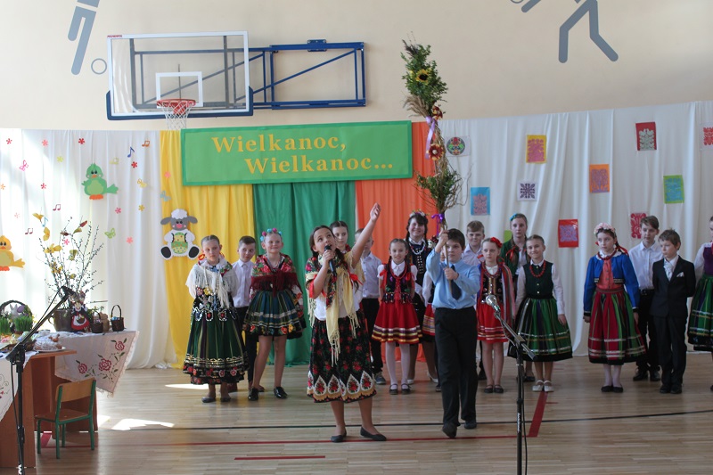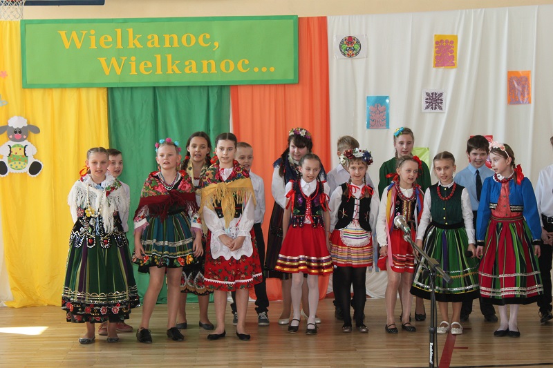 10.04.2017 r. był okazją do spotkania całej braci szkolnej i zaproszonych gości, którzy licznie przybyli na naszą szkolną uroczystość wielkanocną. W tym roku prezentowała się klasa IVb szkoły podstawowej. Program artystyczny rozpoczął się dźwiękami muzyki Atonio Vivaldiego „Wiosna”. Uczniowie w odświętnych strojach przybliżyli wszystkim wielkanocne obyczaje. Oglądających zachwyciły stroje ludowe w jakich wyjątkowo urokliwie prezentowały się dziewczęta. Furkotały spódniczki i wstążki, bujały korale i warkocze. Uczniowie malowali pisanki, prezentowali dostojną palmę wielkanocną, babę z ciasta i baranka cukrowego. Z zaangażowaniem deklamowali wiersze i śpiewali piosenki tematyczne. Nie zabrakło wielkanocnej, wzruszającej pieśni „Alleluja”. Czwartoklasiści podzielili się ze wszystkimi jajkiem i obdarowali oglądających pisankami wielkanocnymi, które sami wykonali. Występ uświetniły dzieci klas młodszych wykonując „Taniec kurcząt w skorupkach” Modesta Musorgskiego. Ten żywy obrazek wyjątkowo chwytał za serce. Dumę odczuwali zwłaszcza zgromadzeni rodzice pociech. Na scenie panowała radosna, świąteczna atmosfera. Klimat wielkanocnej wiosny widoczny był w scenografii. Jasne, żywe kolory, zieleń gałązek i wyeksponowany stół z dobrami wielkanocnymi wpisały się w świąteczny nastrój. Przyjemnie było wrócić słowami i piosenką do dawnych zwyczajów śmigusa –dyngusa, wspólnego uwijania palm wielkanocnych i gromadnego biesiadowania przy świątecznym stole.