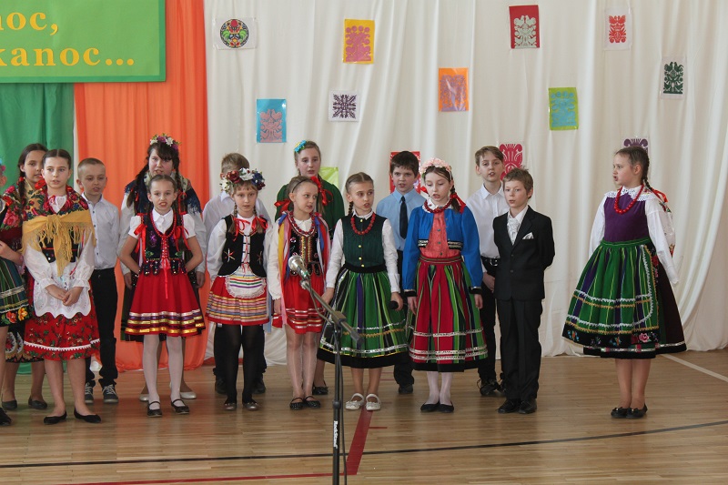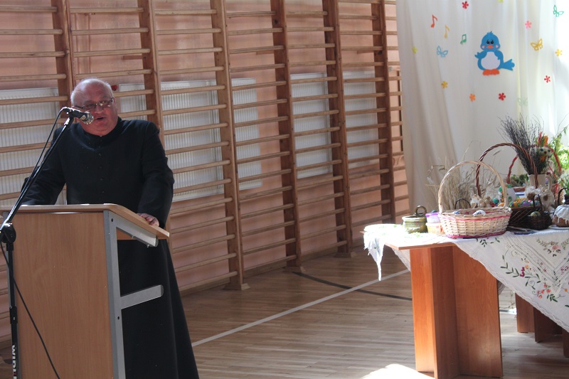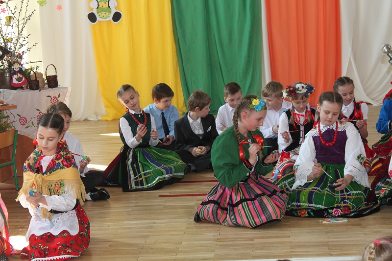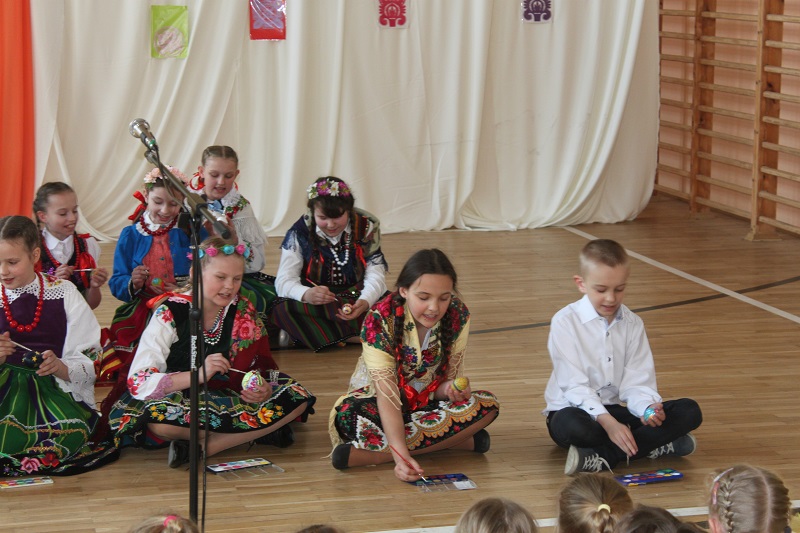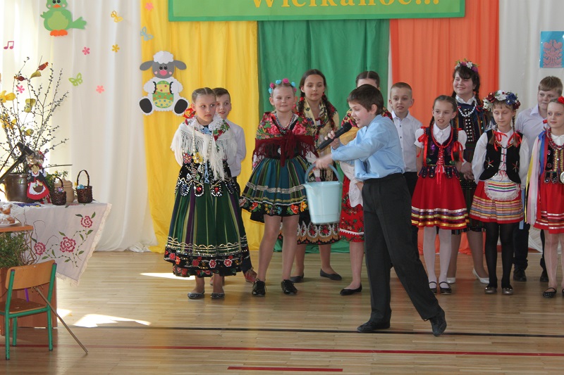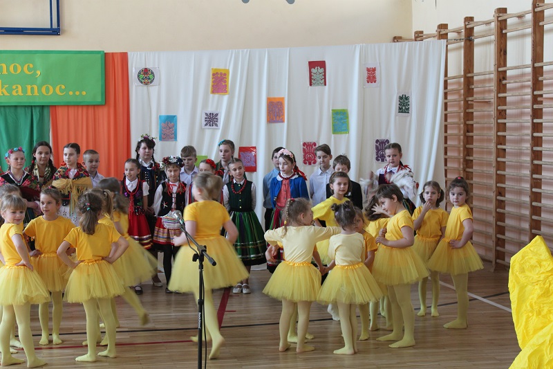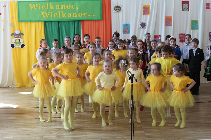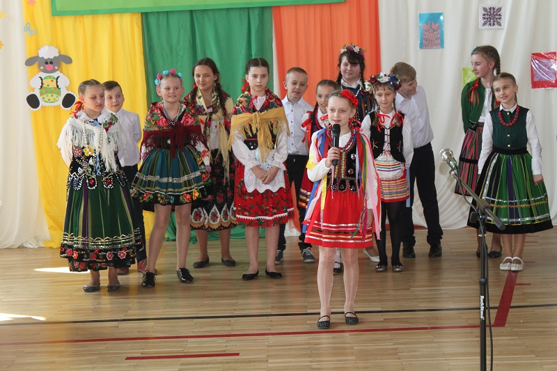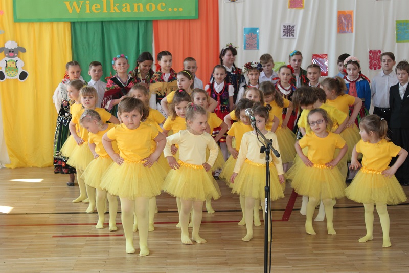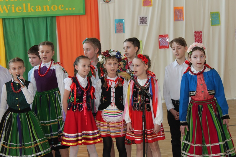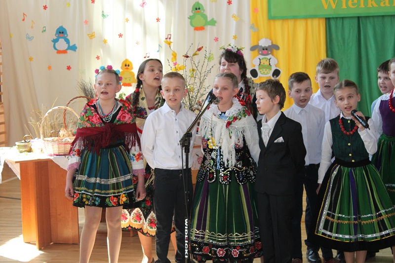 10.04.2017 r. był okazją do spotkania całej braci szkolnej i zaproszonych gości, którzy licznie przybyli na naszą szkolną uroczystość wielkanocną. W tym roku prezentowała się klasa IVb szkoły podstawowej. Program artystyczny rozpoczął się dźwiękami muzyki Atonio Vivaldiego „Wiosna”. Uczniowie w odświętnych strojach przybliżyli wszystkim wielkanocne obyczaje. Oglądających zachwyciły stroje ludowe w jakich wyjątkowo urokliwie prezentowały się dziewczęta. Furkotały spódniczki i wstążki, bujały korale i warkocze. Uczniowie malowali pisanki, prezentowali dostojną palmę wielkanocną, babę z ciasta i baranka cukrowego. Z zaangażowaniem deklamowali wiersze i śpiewali piosenki tematyczne. Nie zabrakło wielkanocnej, wzruszającej pieśni „Alleluja”. Czwartoklasiści podzielili się ze wszystkimi jajkiem i obdarowali oglądających pisankami wielkanocnymi, które sami wykonali. Występ uświetniły dzieci klas młodszych wykonując „Taniec kurcząt w skorupkach” Modesta Musorgskiego. Ten żywy obrazek wyjątkowo chwytał za serce. Dumę odczuwali zwłaszcza zgromadzeni rodzice pociech. Na scenie panowała radosna, świąteczna atmosfera. Klimat wielkanocnej wiosny widoczny był w scenografii. Jasne, żywe kolory, zieleń gałązek i wyeksponowany stół z dobrami wielkanocnymi wpisały się w świąteczny nastrój. Przyjemnie było wrócić słowami i piosenką do dawnych zwyczajów śmigusa –dyngusa, wspólnego uwijania palm wielkanocnych i gromadnego biesiadowania przy świątecznym stole.