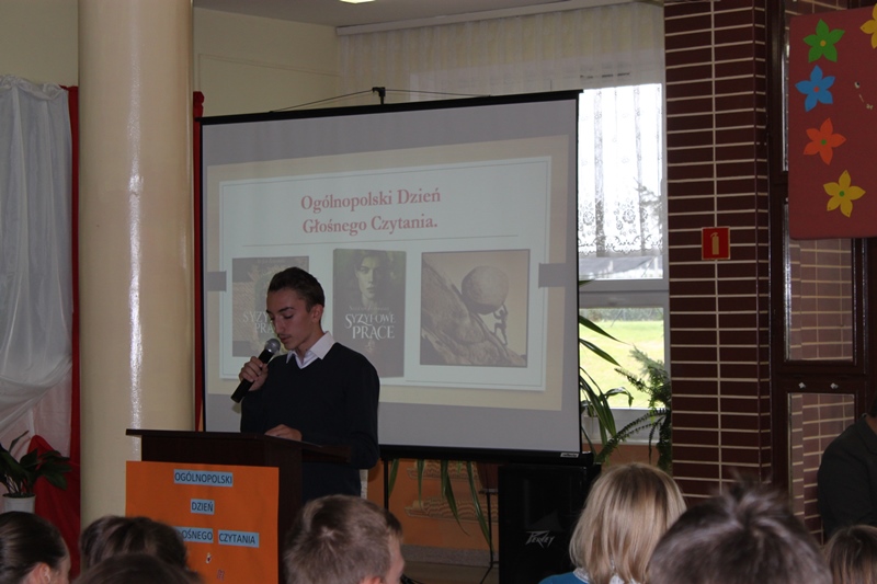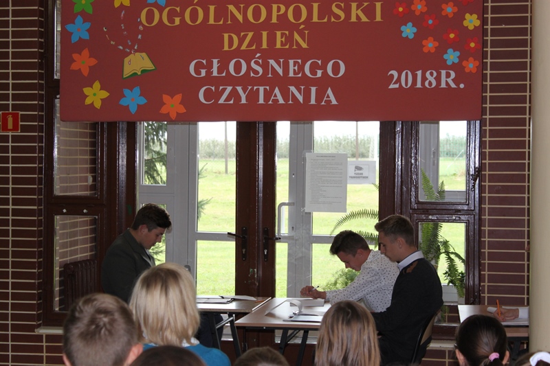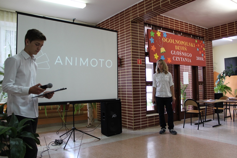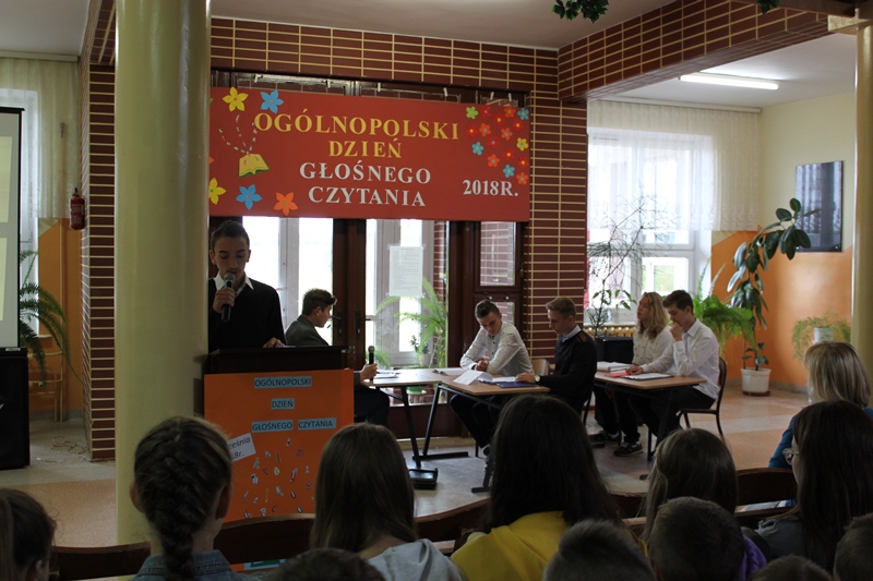 Zatem 27 września 2018 r. uczniowie klas III Gimnazjum: Michał Czerwiński, Piotr Kwaśniewski, Jakub Pacholik, Marcin Pieczątkowski, Mateusz Pękalak, Jakub Szcześniak zaprosili w ramach realizacji projektu edukacyjnego pt. "Czytanie łączy pokolenia" do wysłuchania prezentacji pt. "Dlaczego warto czytać na głos?".