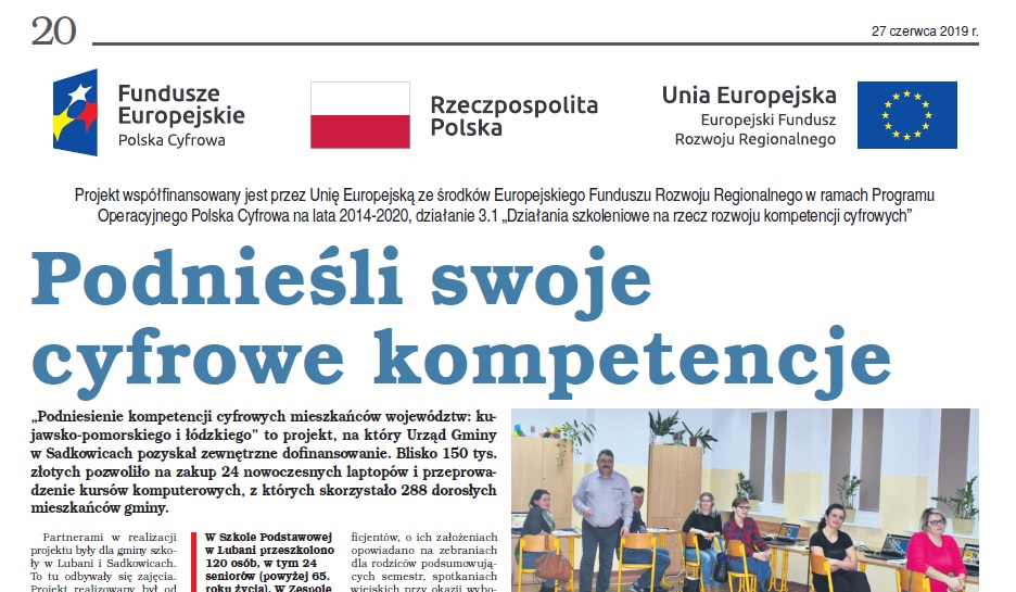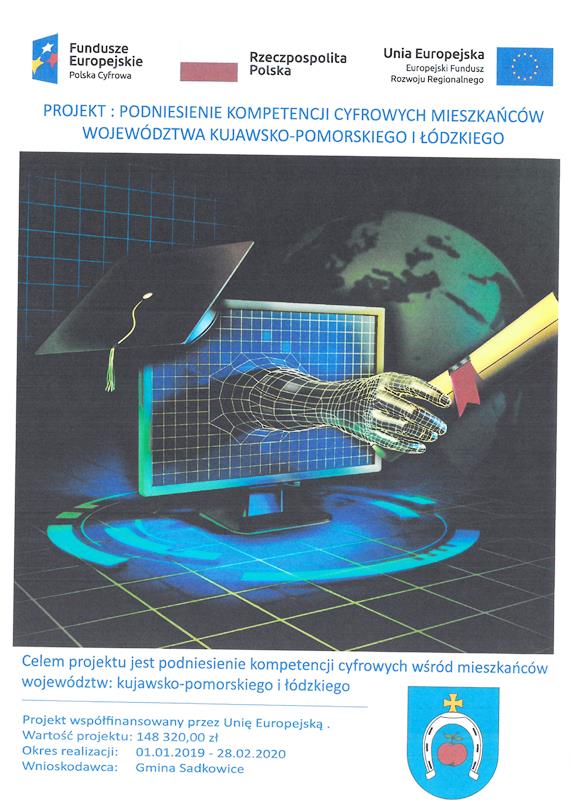 W dniu 18 lutego 2019 r. pani Wójt Karolina Kowalska w imieniu Gminy Sadkowice przy kontrasygnacie Skarbnika Gminy pana Tomasza Szymańskiego podpisze umowę na realizację projektu w ramach Programu Operacyjnego Polska Cyfrowa na lata 2014-2020 Osi Priorytetowej nr III: Cyfrowe Kompetencje społeczeństwa Działania 3.1 „Działania szkoleniowe na rzecz rozwoju kompetencji cyfrowych” dotycząca realizacji projektu grantowego pn. „Podniesienie kompetencji cyfrowych mieszkańców województw: kujawsko-pomorskiego i łódzkiego”.